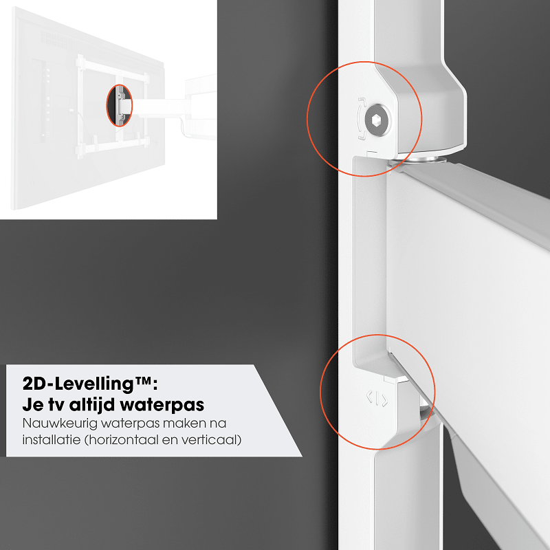- Montaje perfectamente recto: nivelador incluido. 2D-Leveling™: su televisor siempre nivelado: nivelación precisa tras la instalación (horizontal y vertical).